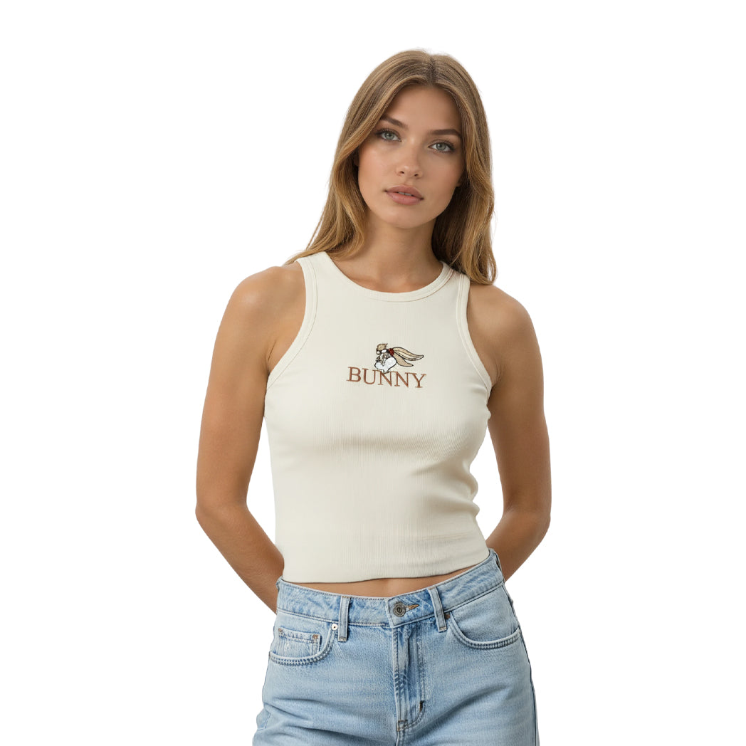 גופיה מבד ריב נעים בצבע קרם עם רקמת לולה באני - לוני טונס