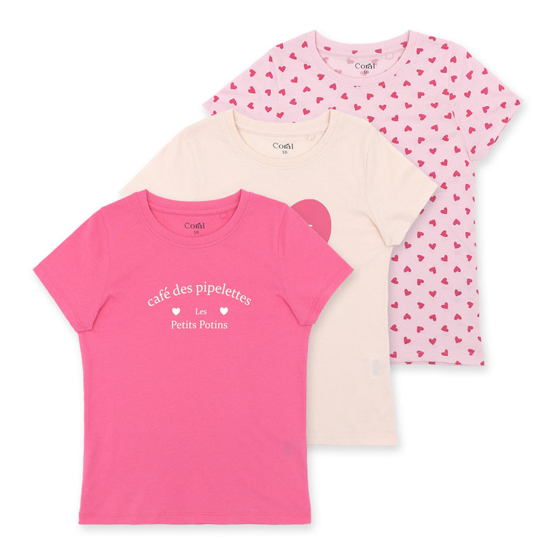 שלישיית חולצות בנות מודפסות בגווני ורוד ואפרסק