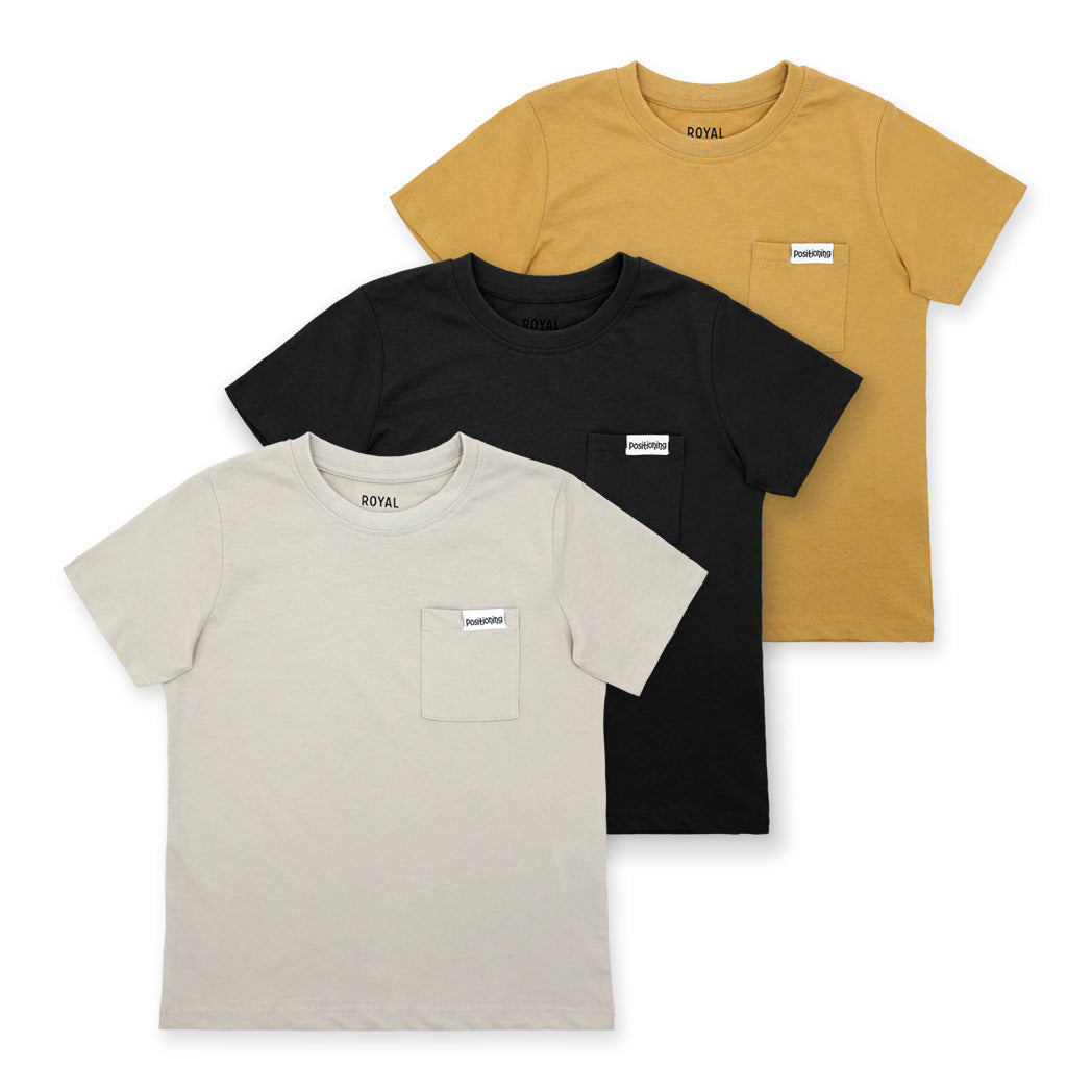 שלישיית חולצות בנים חלקות עם תג וכיס בצהוב, שחור וגוון אבן