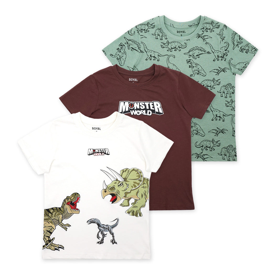 שלישיית חולצות בנים עם הדפסי דינוזאורים בגווני קרם, מנטה וחום בריק