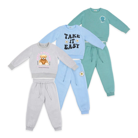 שלישיית חליפות מודפסות Cat Girl, דובי ופרחים עם מכנסי טייץ
