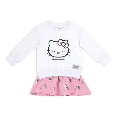 שמלת בנות לבנה ורודה עם הדפס Hello Kitty עם חצאית בד טטרה בד 53% כותנה 42% פוליאסטר 5%...