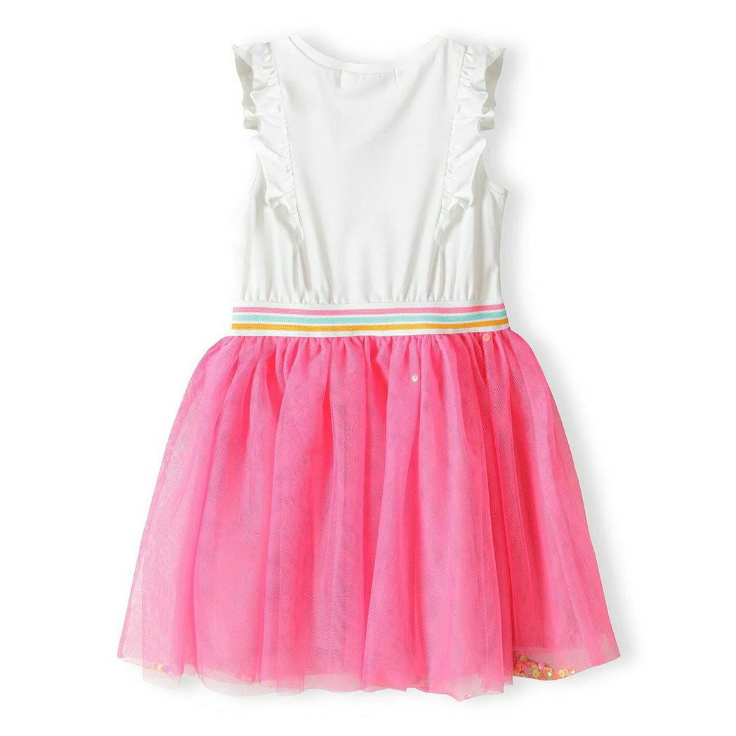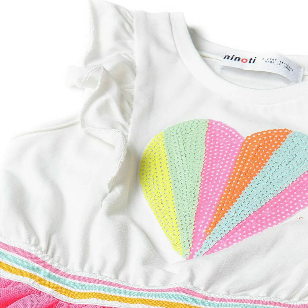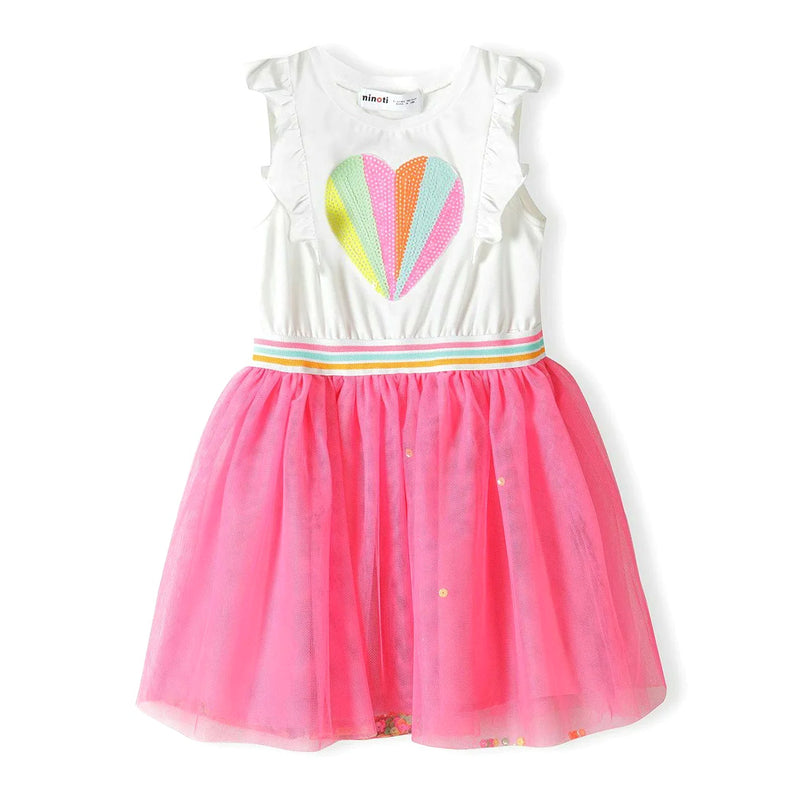 שמלת קיץ חגיגית לתינוקת עם חצאית טול בצבע ורוד-ניאון ואפליקציית לב פאייטים