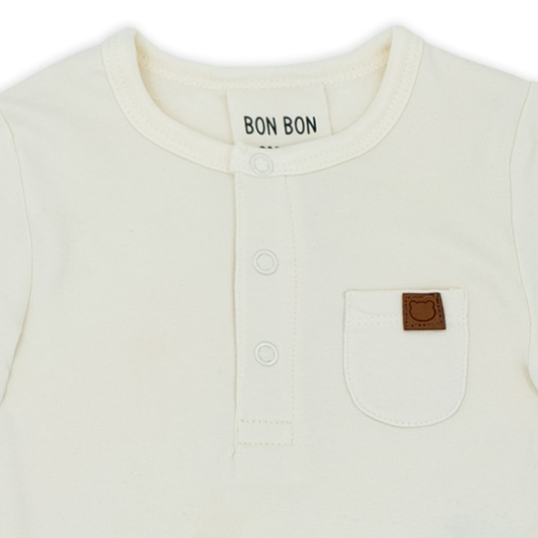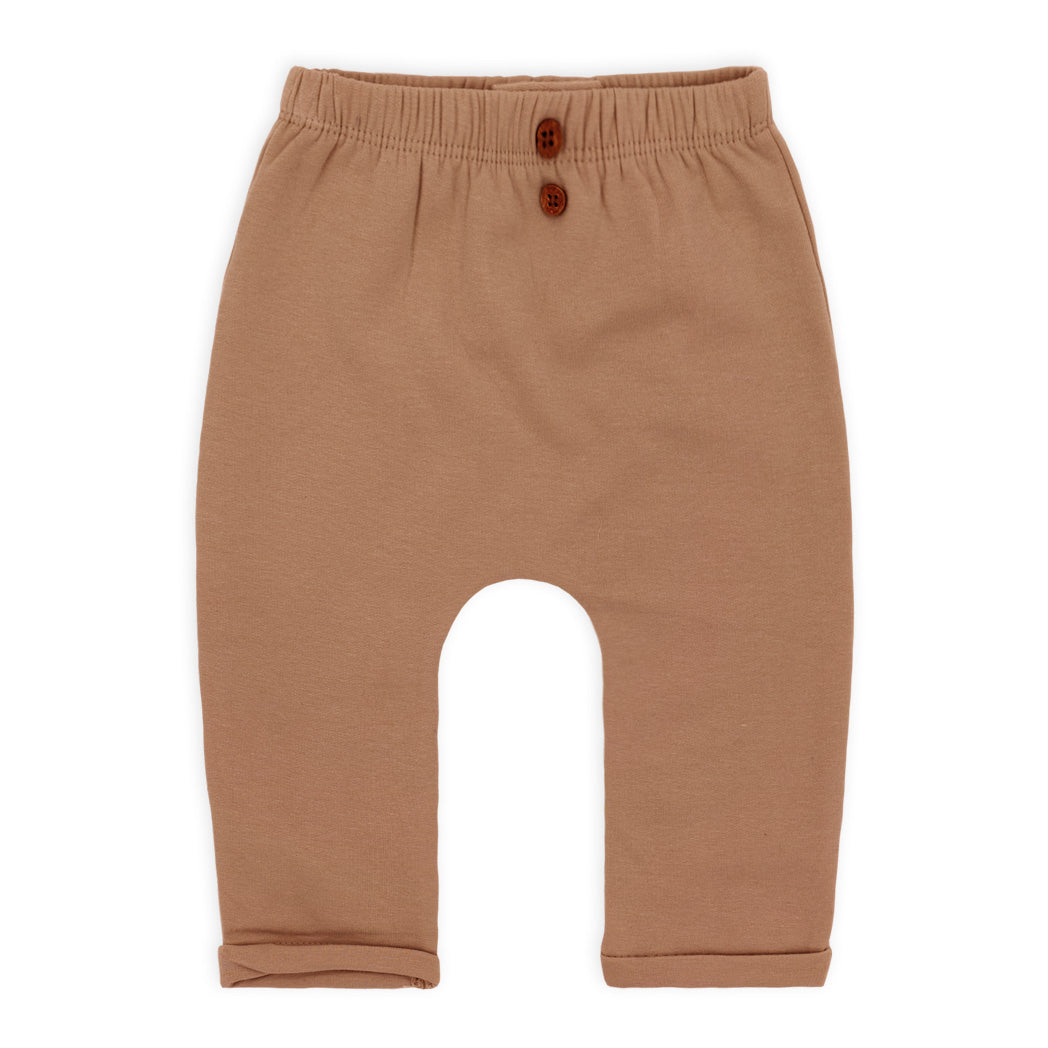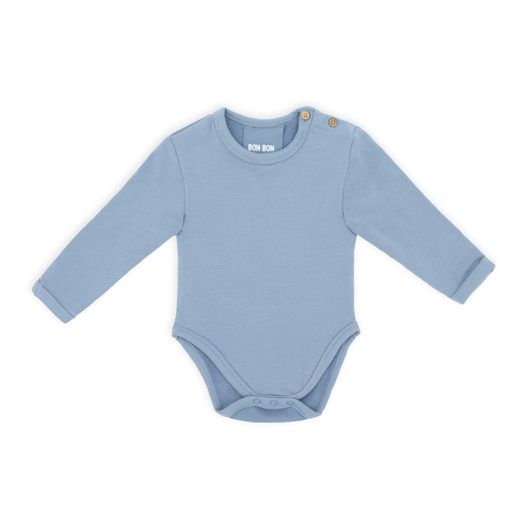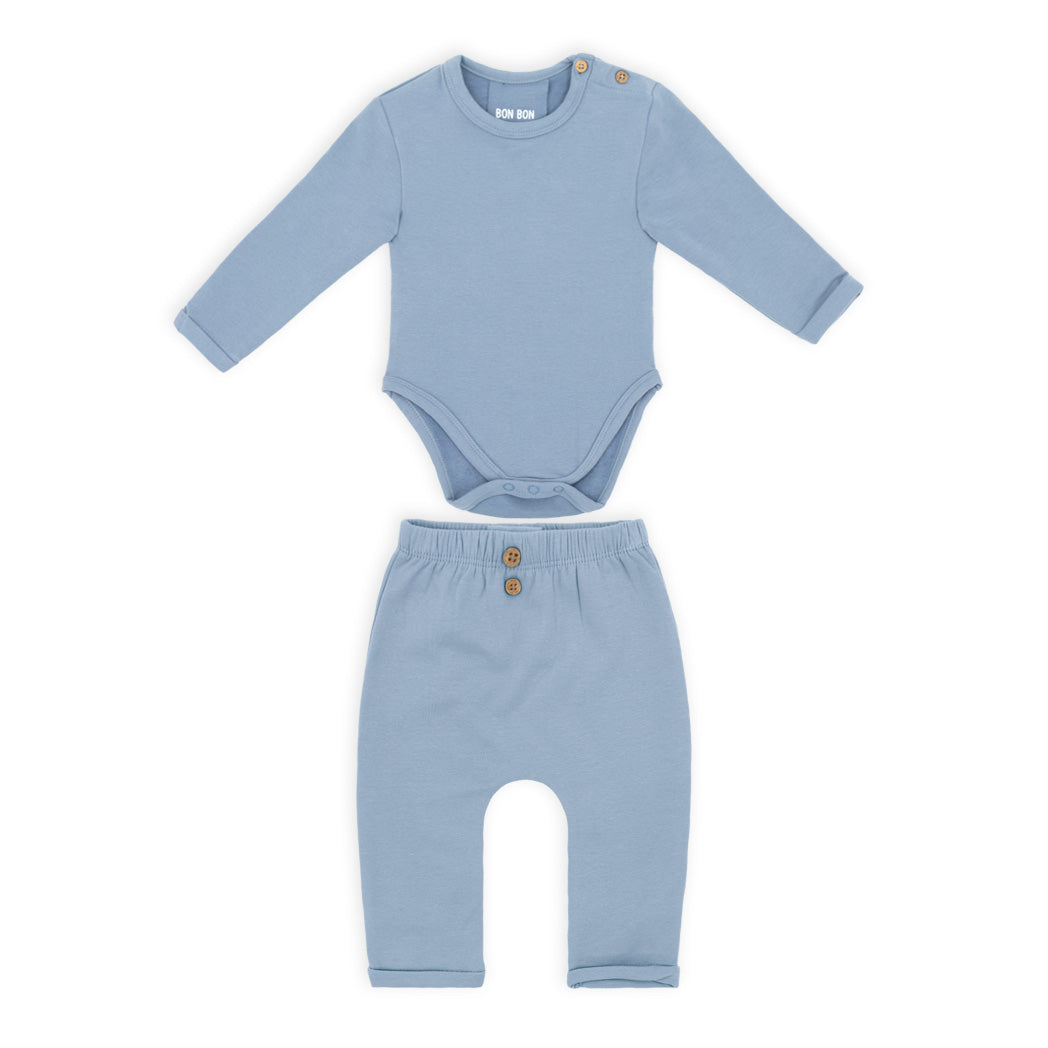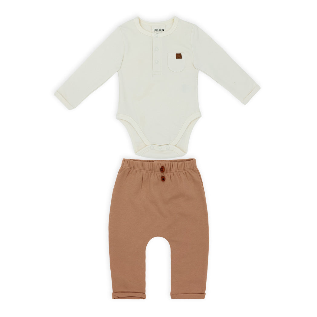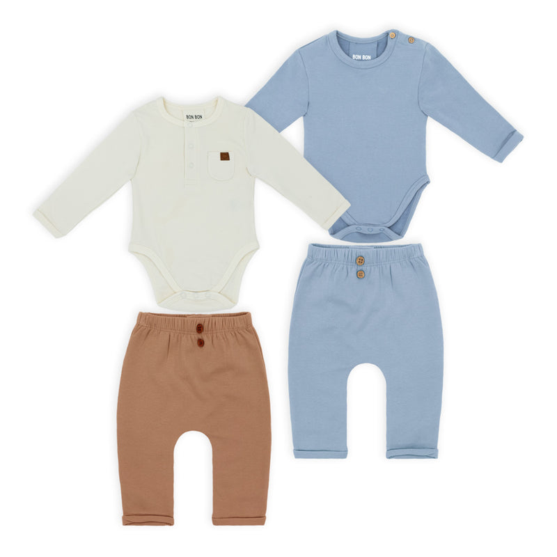 זוג חליפות בגד גוף לתינוק בשני חלקים בגווני תכלת, קאמל וחום בהיר