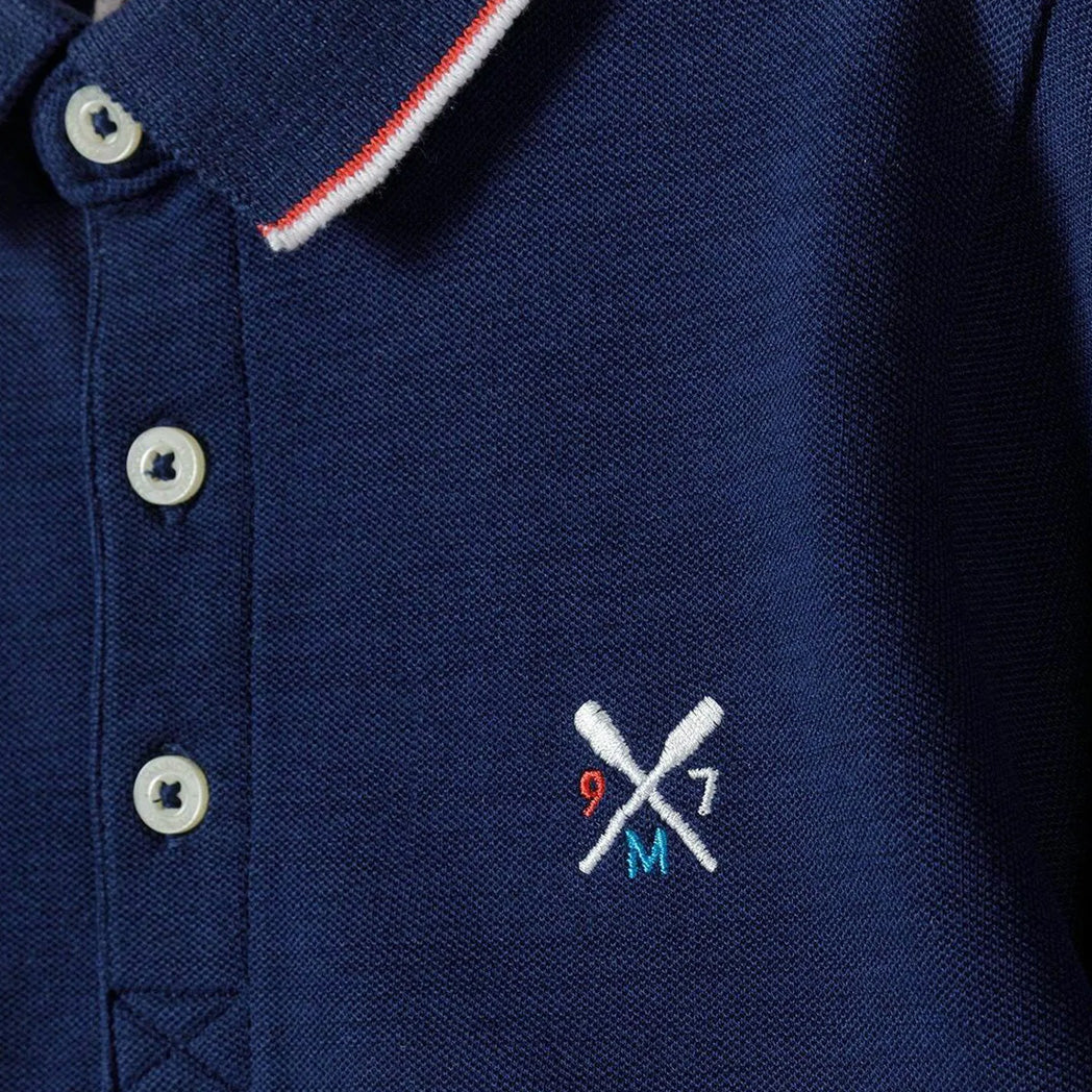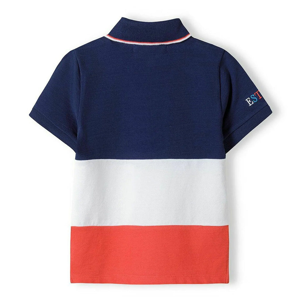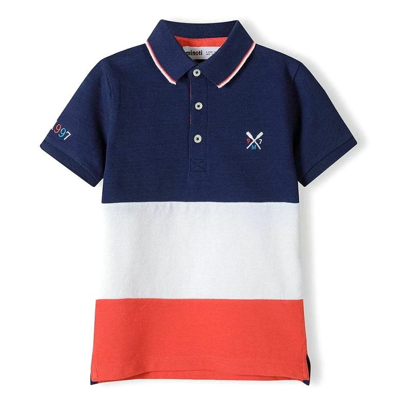 חולצת פולו מינוטי בגווני כחול נייבי, לבן וכתום כהה עם כפתורים ורקמה