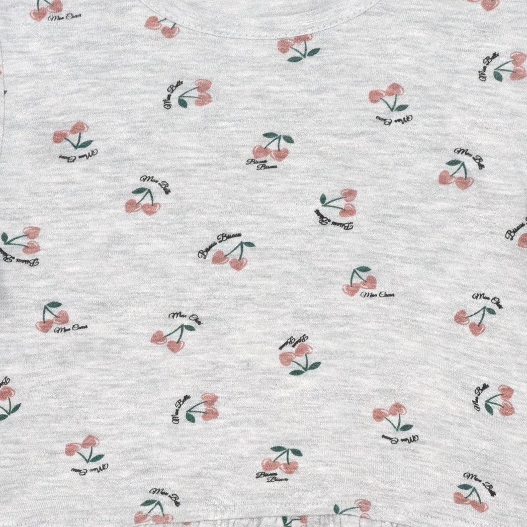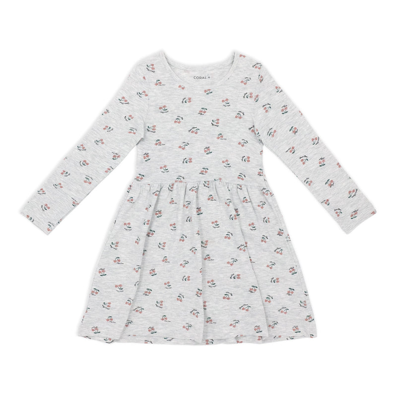 שמלת בנות לעונת מעבר בצבע אפור מלאנז' והדפסי לבבות דובדבנים