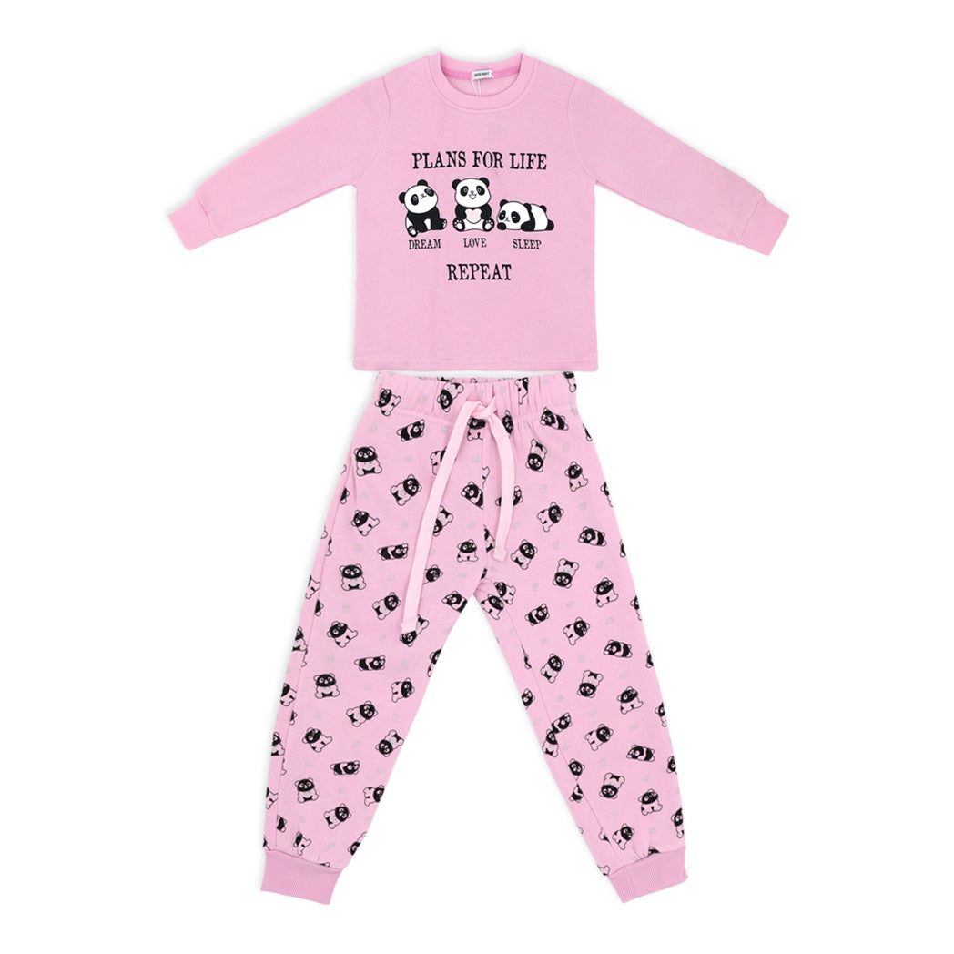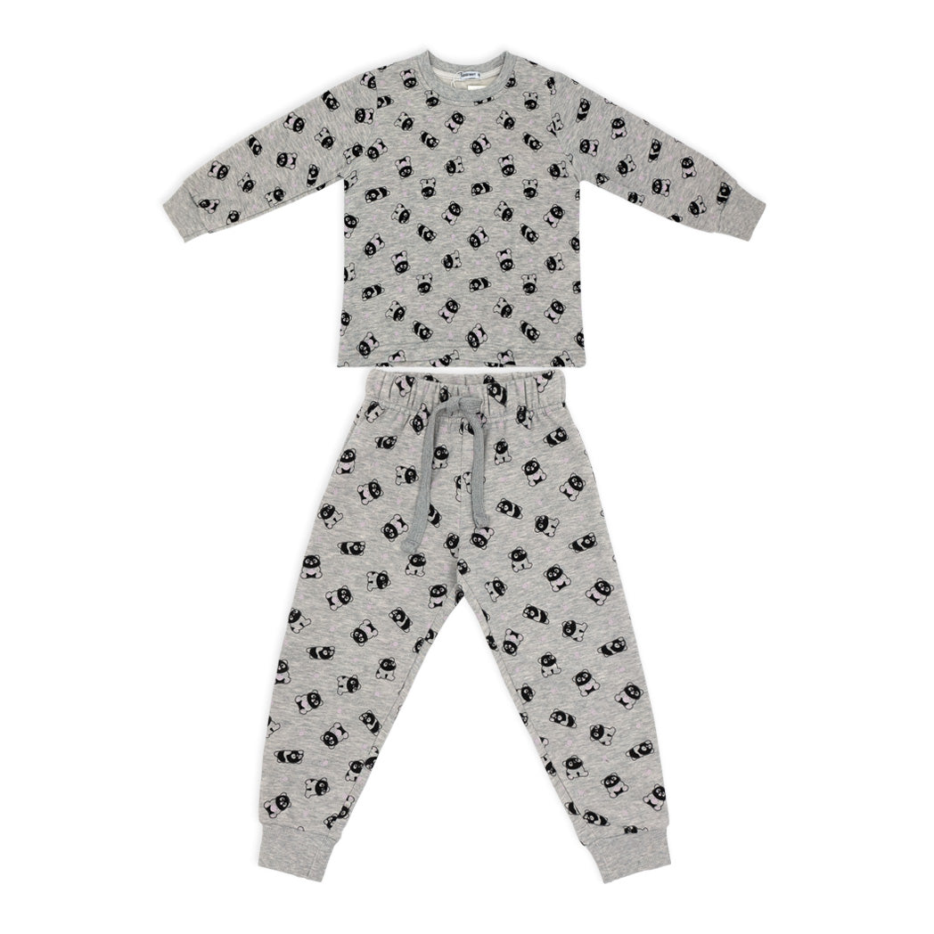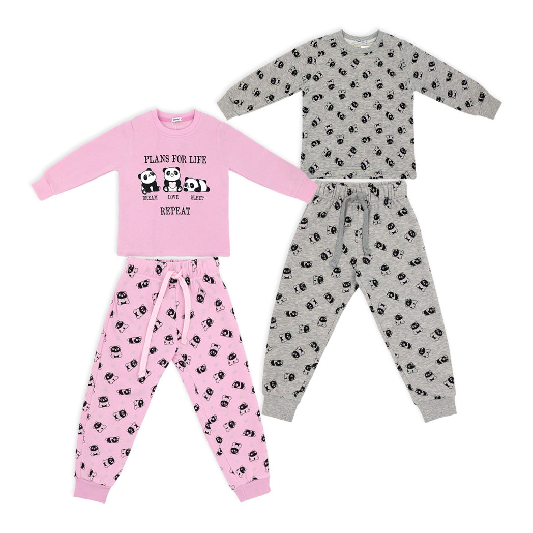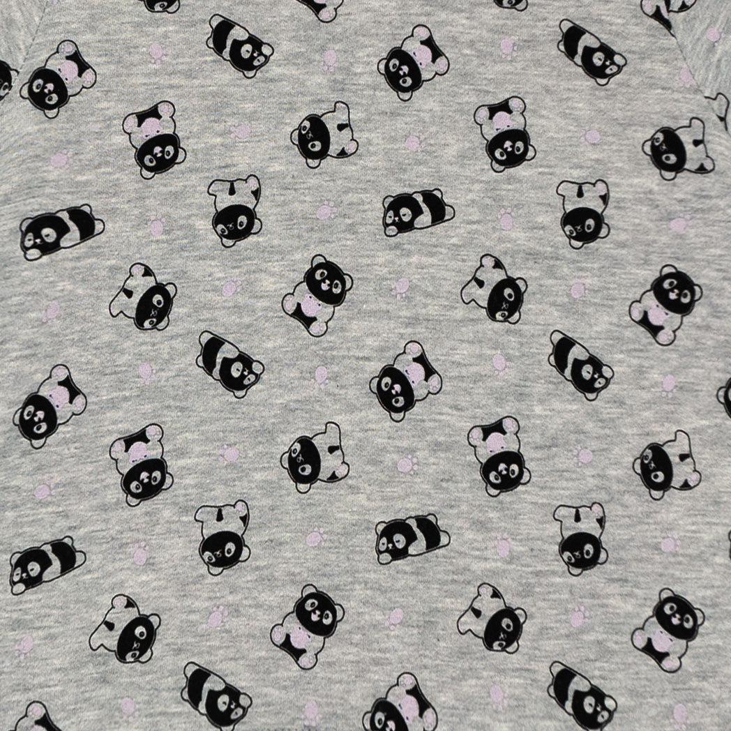 פיג'מת פוטר עבה לילדות בגווני ורוד ואפור עם הדפסי פנדות