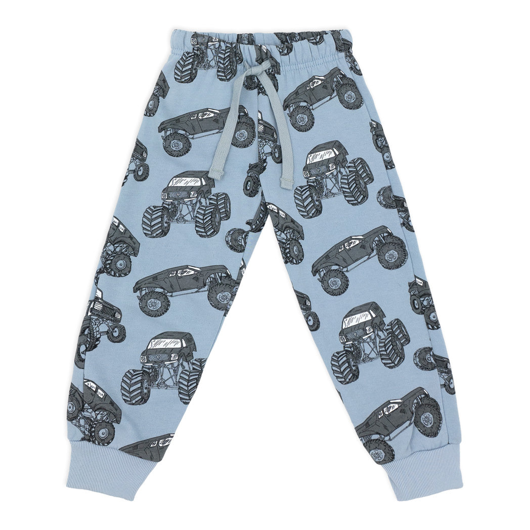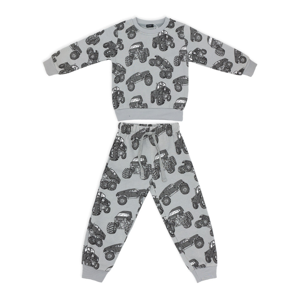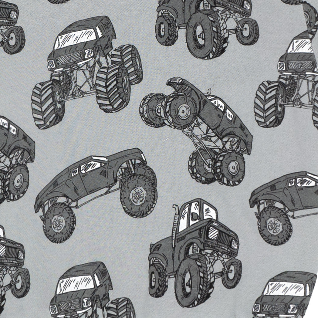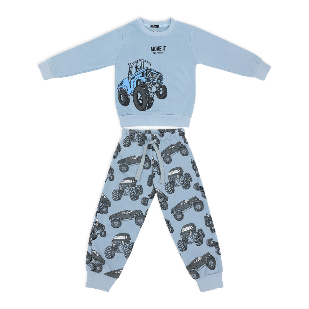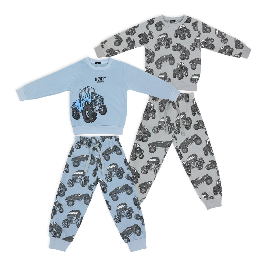 פיג'מת פוטר עבה לילדים ופעוטות בגווני תכלת ואפור עם הדפסי משאיות וטרקטורים