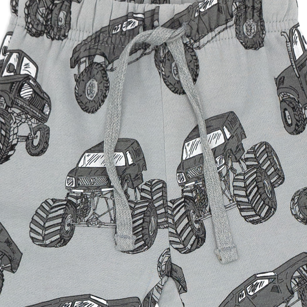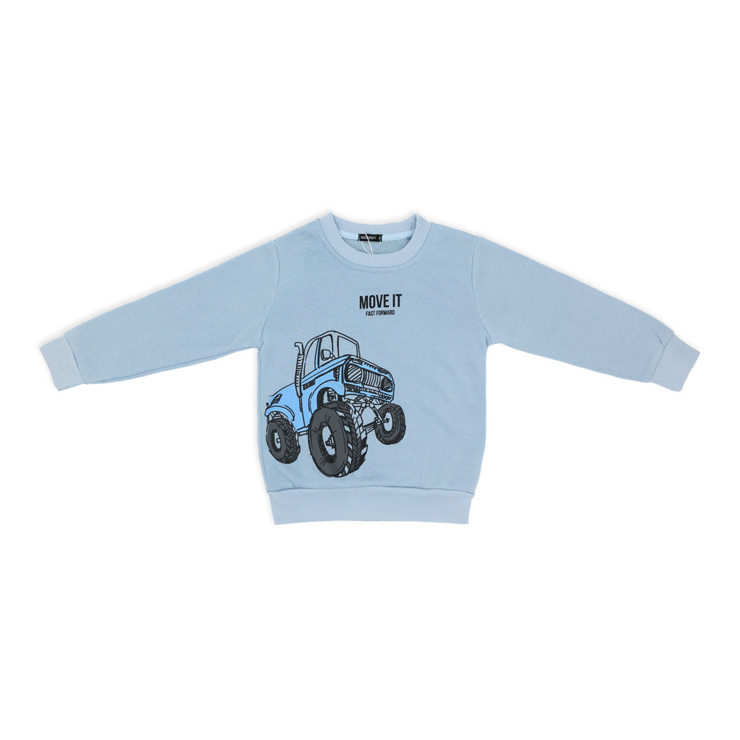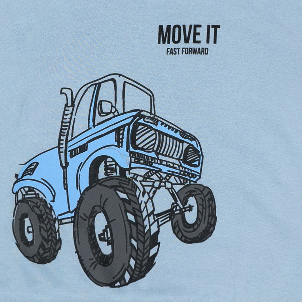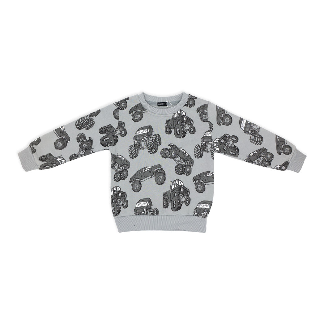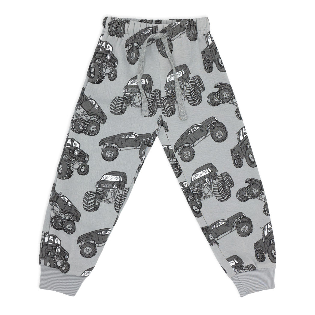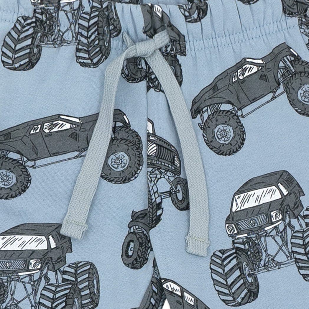פיג'מת פוטר עבה לילדים ופעוטות בגווני תכלת ואפור עם הדפסי משאיות וטרקטורים