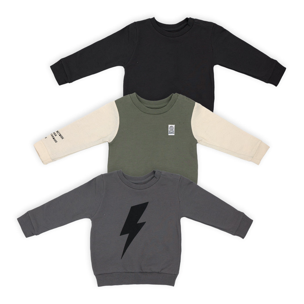 שלישיית חולצות פוטר חמות לתינוק - אפורה עם הדפס ברק, שחורה וירוקה עם שרוולים בגוון קרם