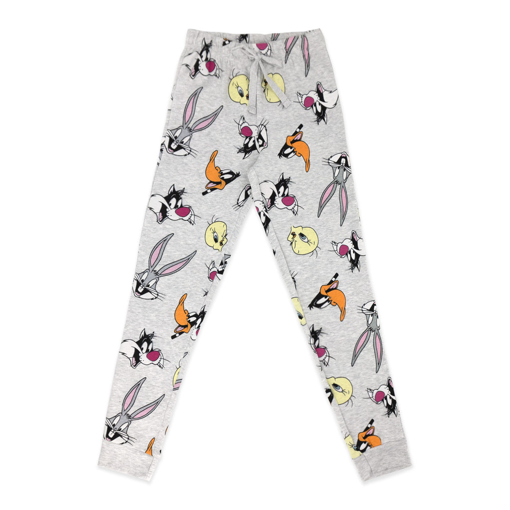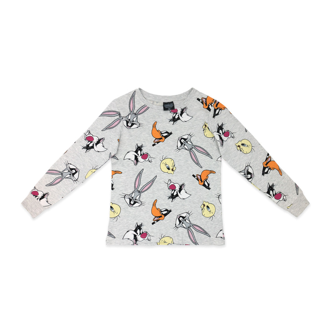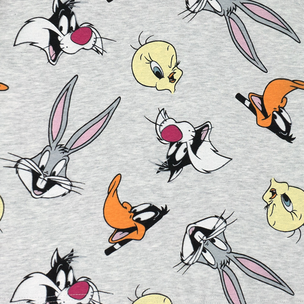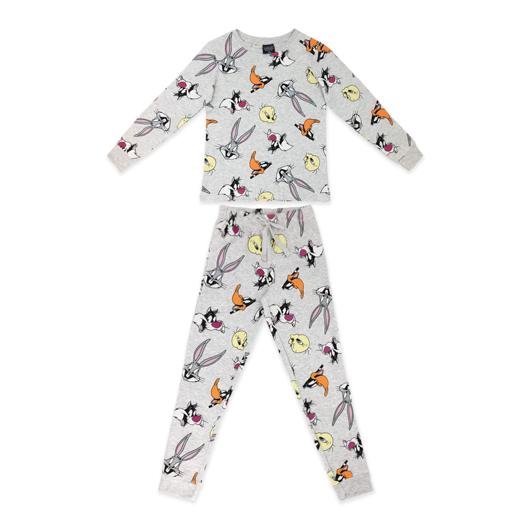 פיג'מת בנות ונערות בגוון אפור-מלאנז' עם הדפס אולאובר של דמויות לוני טונז