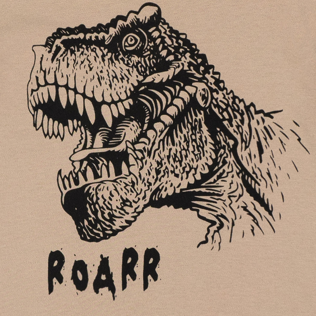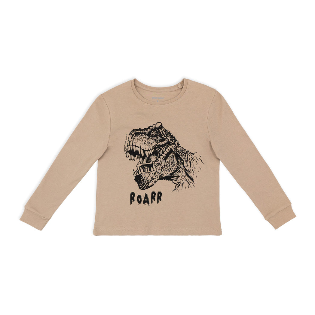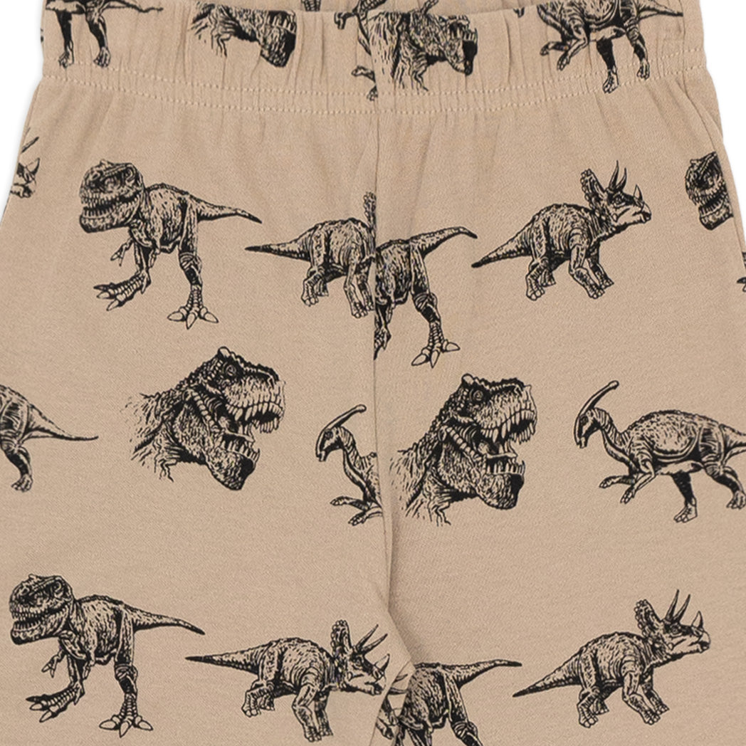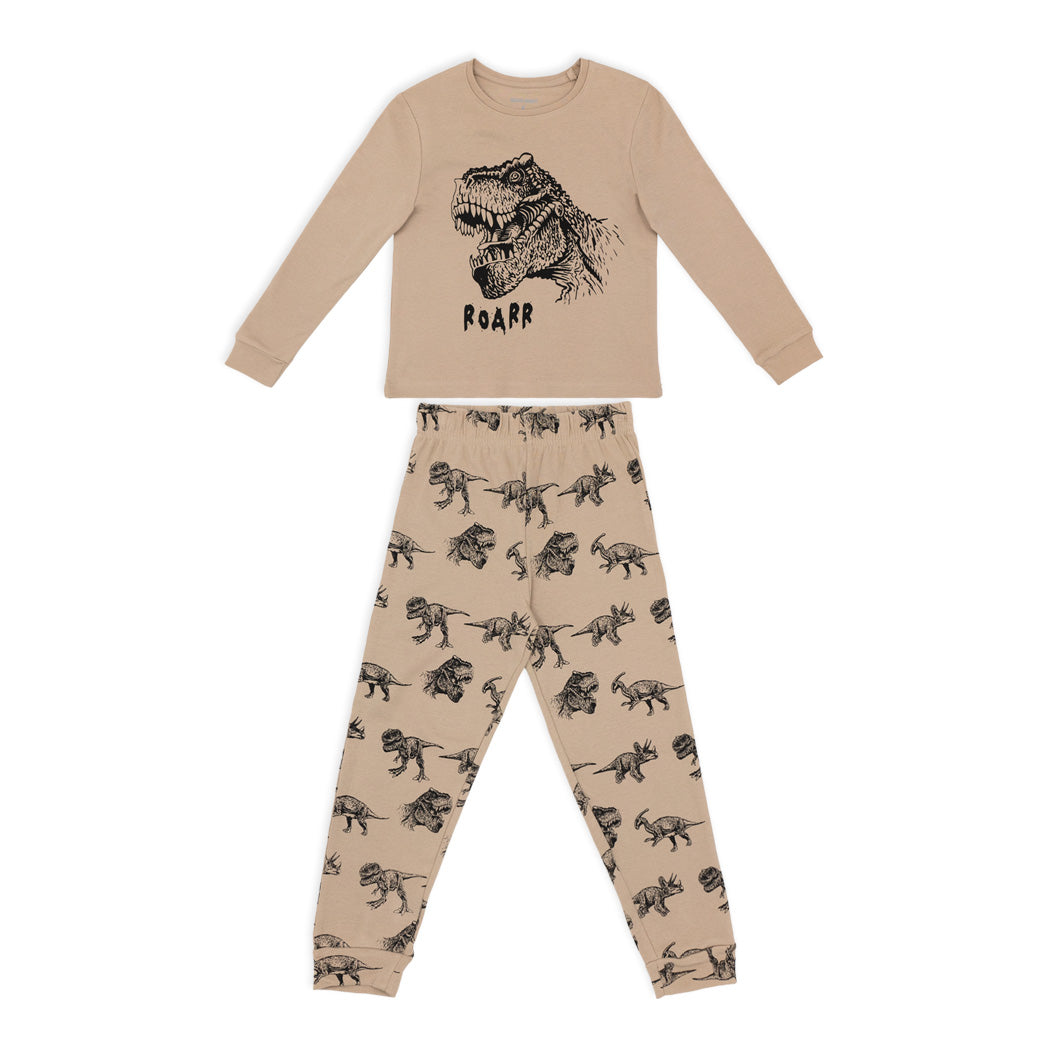 פיג'מה אינטרלוק דקה בגוון חום-כאמל עם הדפסי דינוזאורים