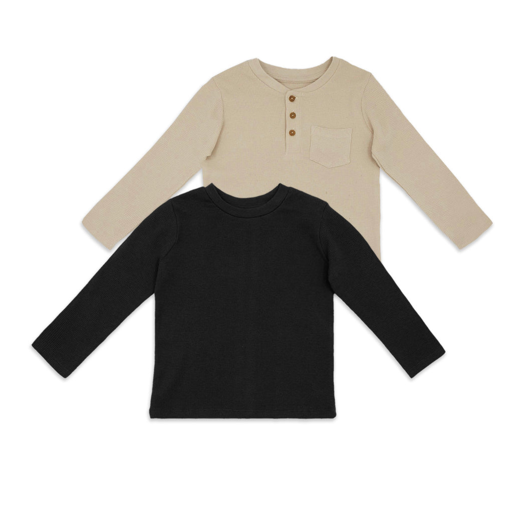 שתי חולצות בנים מבד ופל רך ונעים בצבעי חום-קאמל ושחור, עם ובלי כפתורים