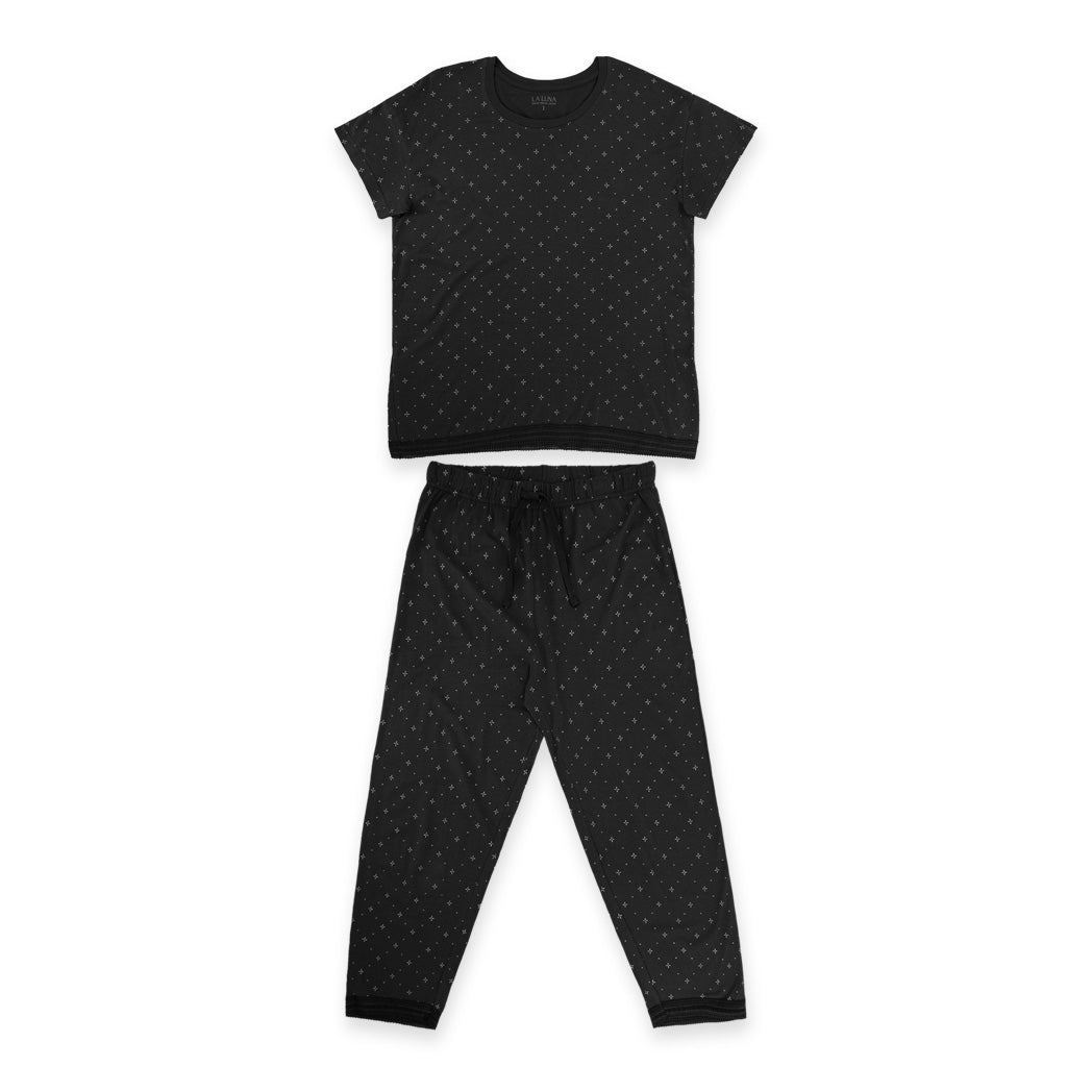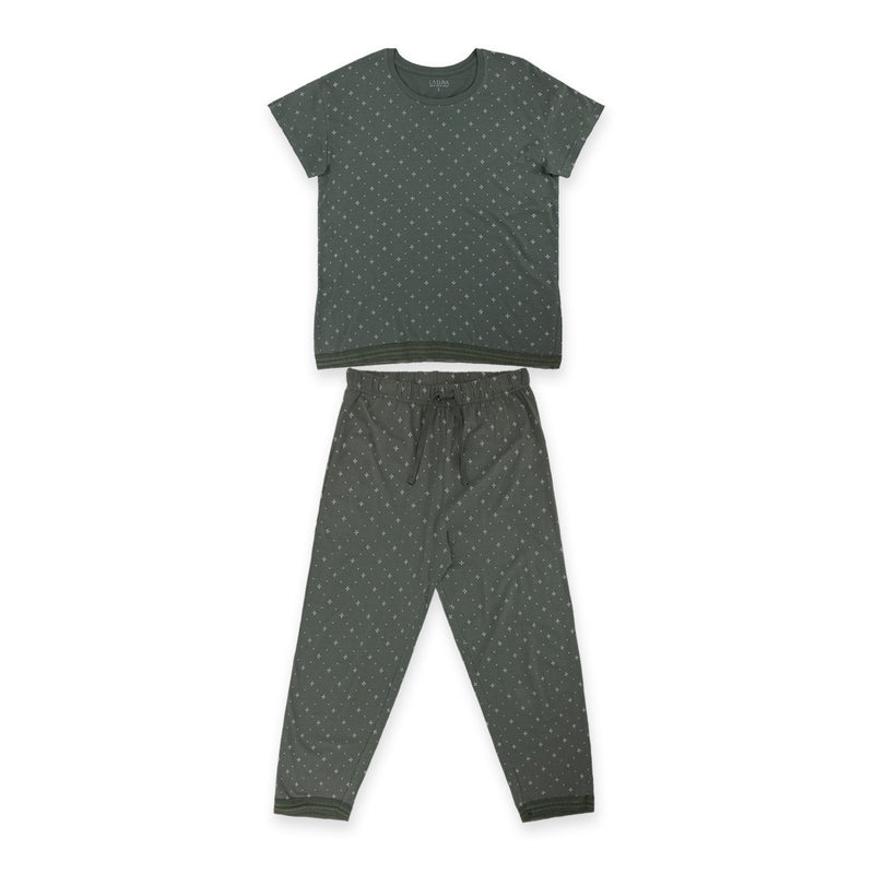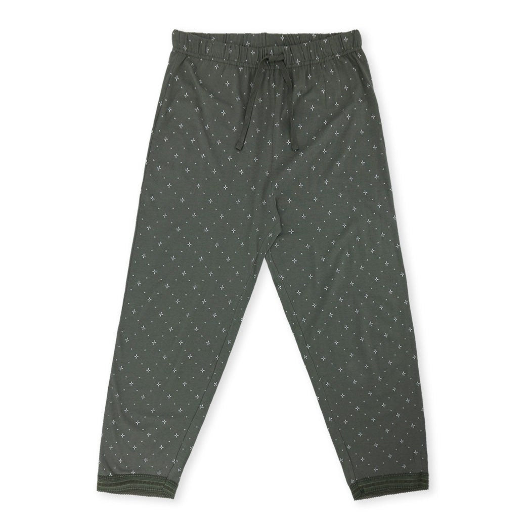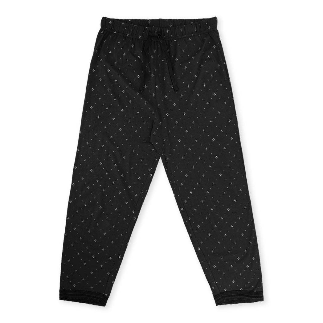 פיג'מת נשים מבד ריב דק ונעים עם מכנס ארוך ותחרה בשוליים, עם הדפס כוכביות אולאובר