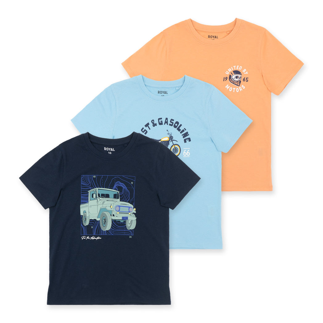 שלישיית חולצות בנים מודפסות בתכלת, כתום ניאון וכחול נייבי